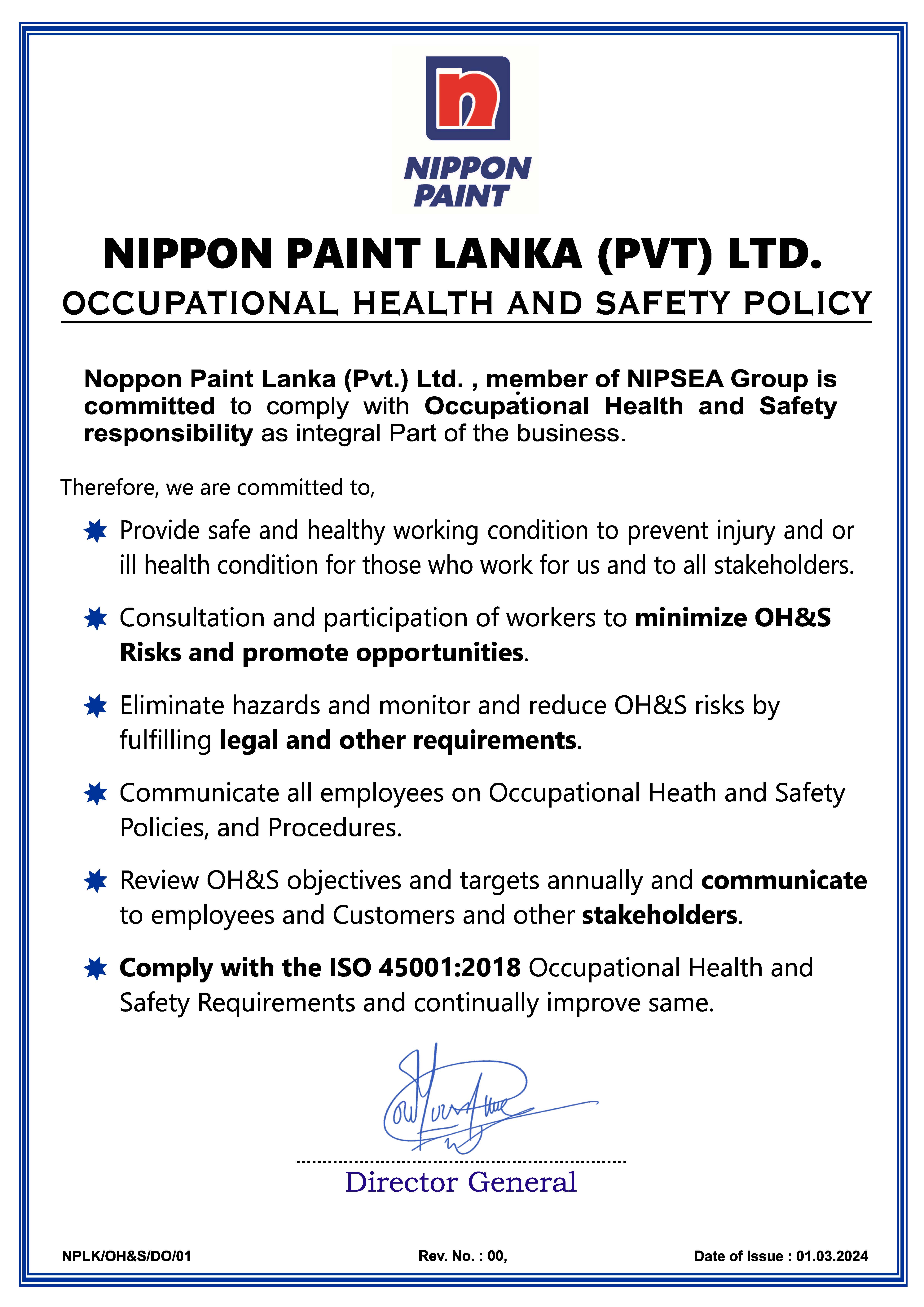 Nippon Paint Lanka earns -"OCCUPATIONAL HEALTH AND SAFETY POLICY"