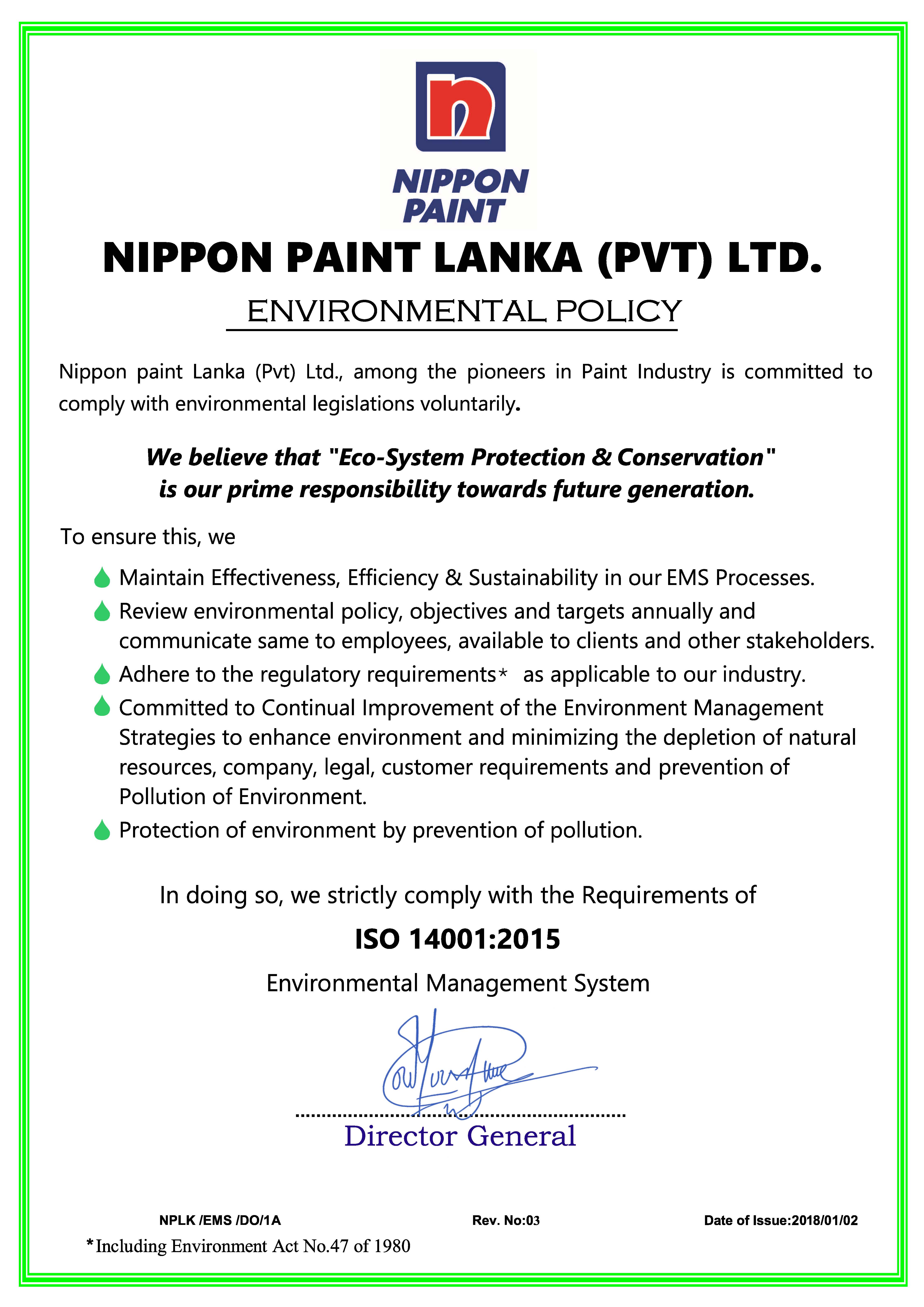 Nippon Paint Lanka earns Eco Label Sri Lanka certification-"ENVIRONMENTAL POLICY"