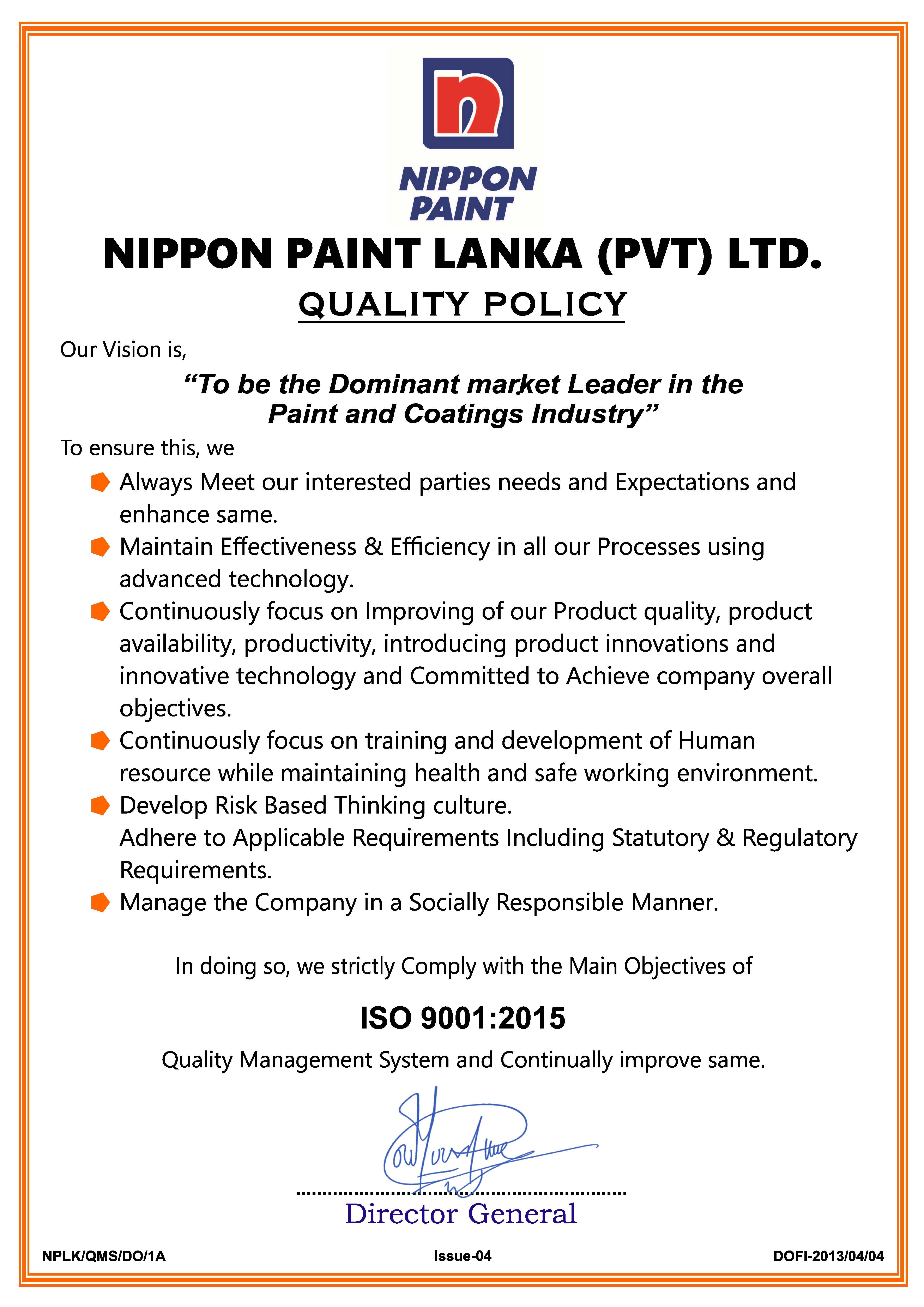 Nippon Paint Lanka earns "QUALITY POLICY" certification.